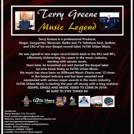 TERRY GREENE IS A SINGER, SONGWRITER, PRODUCER, MUSICIAN, MODEL, RADIO & T.V. TALK SHOW HOST, AND AUTHOR WITH A FUNKY STYLE, A WARM FRIENDLY AND FLAMBOYANT GUY, WHO PULLS HIS FANS INTO HIS MUSIC WITH INNOVATIVE ARRANGEMENTS AND VOCALS, HIS ENERGETIC LYRICS ARE A MIXTURE OF SWEETNESS TEXTURED WITH SOUL, NEO-SOUL, FUNK, AND GOSPEL, ALL OF HIS FANS SAY WHEN WE HEAR HIS MUSIC IT MAKES US FILL LIKE DANCING AND SHOUTING IN 1986 TERRY HAD A HIT RECORD IN THE UK WITH HIS GROUP {LICKKE}’